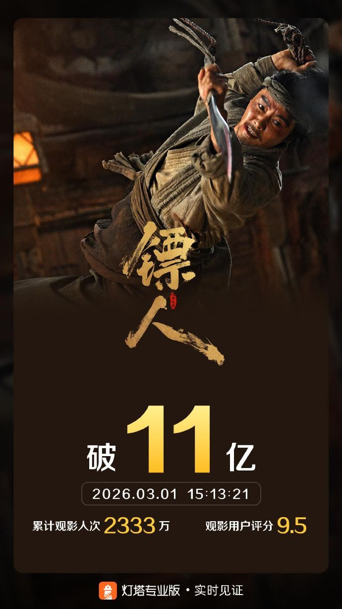 据灯塔专业版实时数据,截至3月1日15时13分,影片《镖人:风起大漠》票房突破11亿。 ​​​