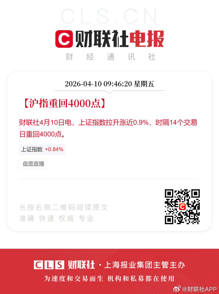 #沪指重回4000点关口#[沪指重回4000点]财联社4月10日电,上证指数拉升涨近0.9%,时隔14个交易日重回4000点。 #A股##A股盘面直播#