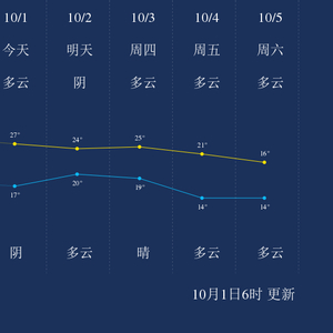 预计,今天白天多云,最高气温27℃,东南风4-5级,今天夜间阴,最低气温17℃,东风4-5级。