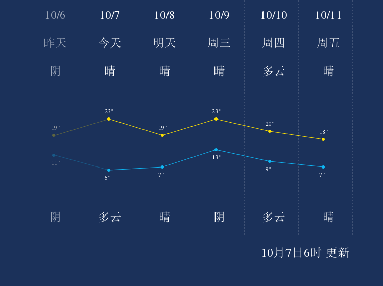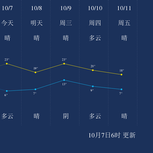 预计,今天白天晴,最高气温23℃,微风,今天夜间多云,最低气温6℃,微风。