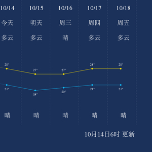 预计,今天白天多云,最高气温28℃,东北风5-6级,今天夜间晴,最低气温21℃,东北风4-5级。