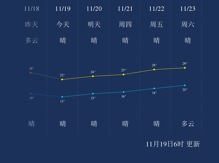 11月19日广州天气早知道 中国天气 中国天气网 2019.11.1907:16 关注 中国天气网讯 今天是11月19日星期二,一起来看天气。今晨6时,广州晴,气温15℃,微风,相对湿度64%。预计,今天白天晴,最高气温22℃,微风,今天夜间晴,最低气温13℃,微风。
