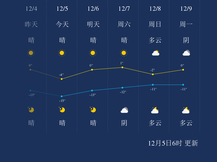 预计,今天白天晴,最高气温-4℃,微风,今天夜间晴,最低气温-15℃,微风。