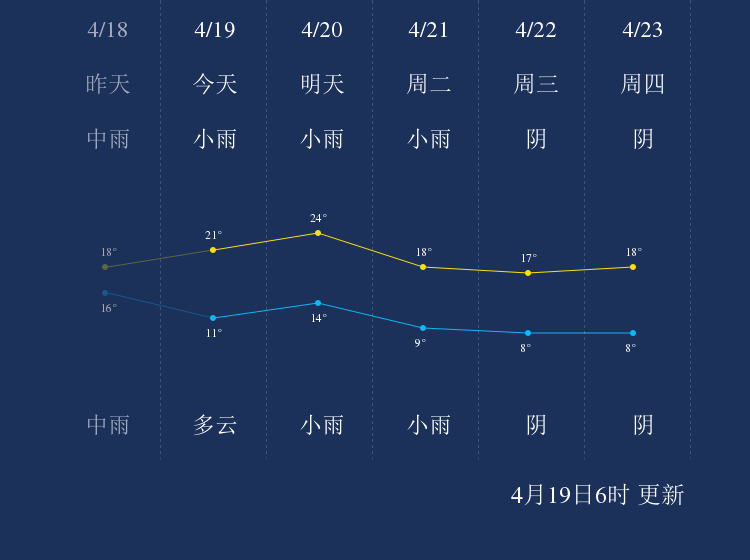 预计,今天白天小雨,最高气温21℃,微风,今天夜间多云,最低气温11℃,微风。