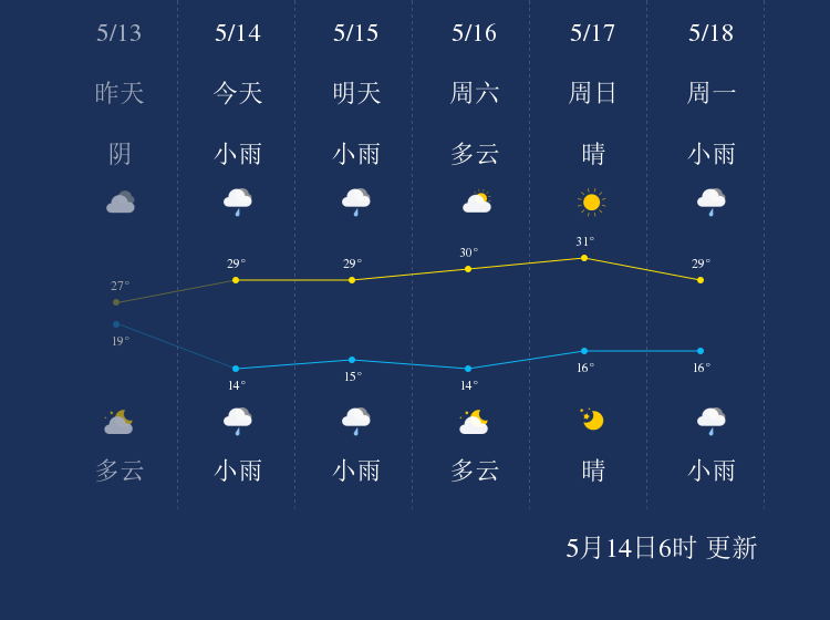 预计,今天白天小雨,最高气温29℃,微风,今天夜间小雨,最低气温14℃,微风。