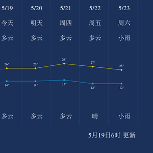 预计,今天白天多云,最高气温26℃,微风,今天夜间多云,最低气温14℃,微风。