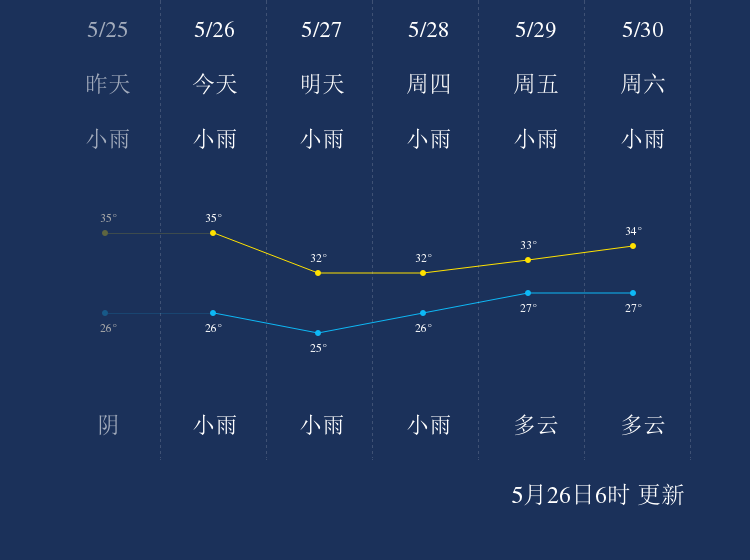 预计,今天白天小雨,最高气温35℃,微风,今天夜间小雨,最低气温26℃,微风。
