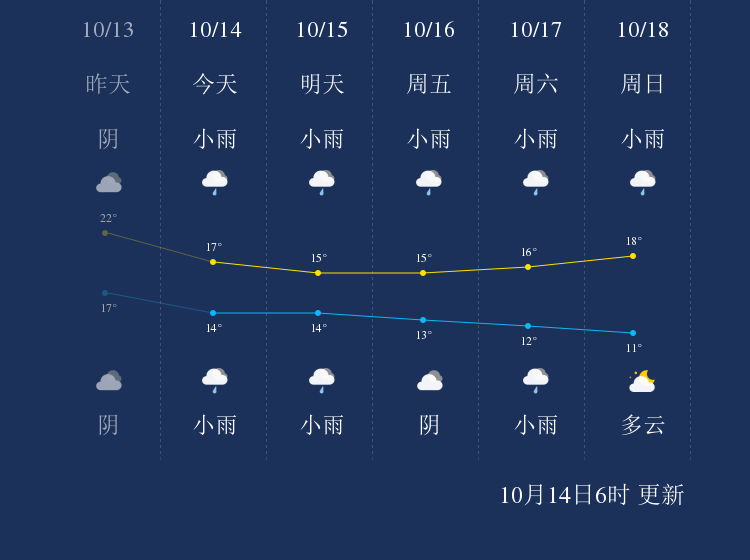 预计,今天白天小雨,最高气温17℃,微风,今天夜间小雨,最低气温14℃,微风。