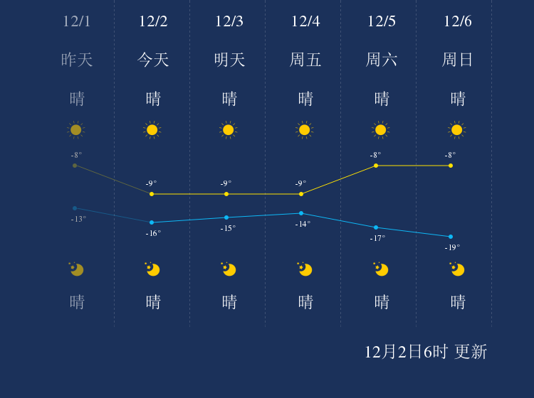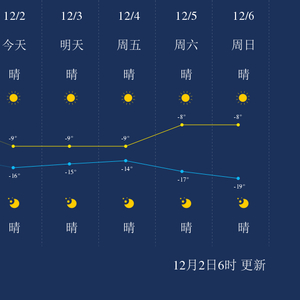 12月2日哈尔滨天气早知道 中国天气 中国天气网 2020.12.0207:15 关注 中国天气网讯 今天是12月2日星期三,一起来看天气。今晨6时,哈尔滨晴,气温-14℃,西南风4-5级,相对湿度75%。预计,今天白天晴,最高气温-9℃,微风,今天夜间晴,最低气温-16℃,微风。