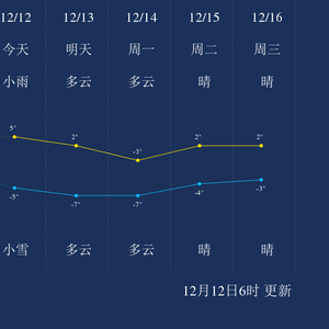 预计,今天白天小雨,最高气温5℃,南风4-5级,今天夜间小雪,最低气温-5℃,北风6-7级。