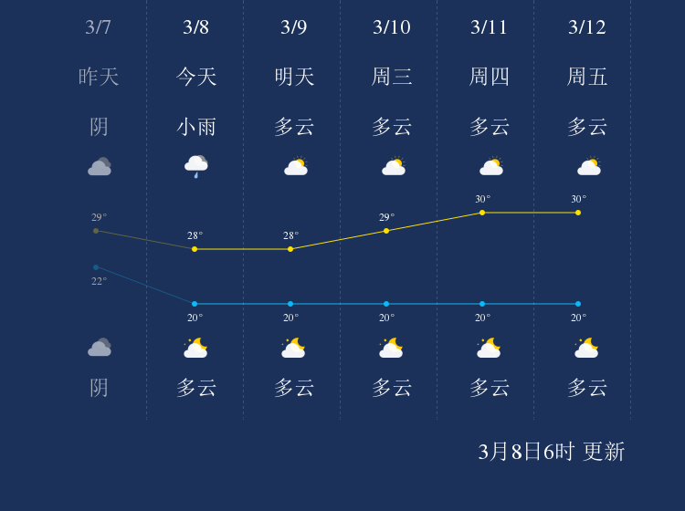 预计,今天白天小雨,最高气温28℃,微风,今天夜间多云,最低气温20℃,微风。