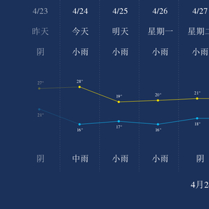 预计,今天白天小雨,最高气温28℃,微风,今天夜间中雨,最低气温16℃,微风。