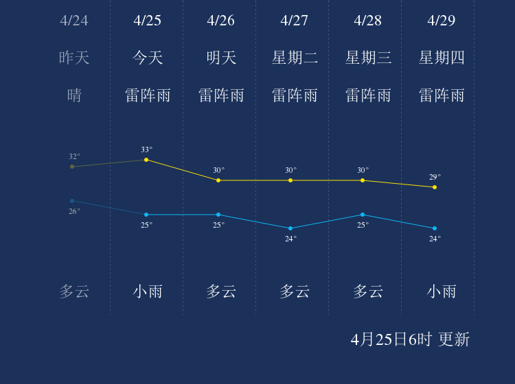 中国天气网讯 今天是4月25日星期日,一起来看天气。