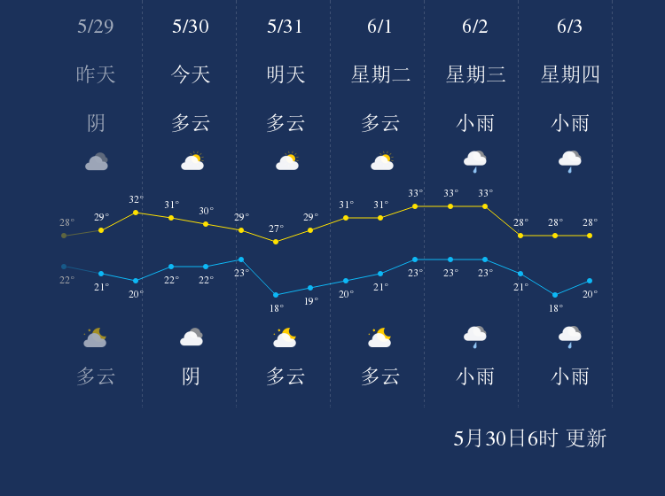 中国天气网讯 今天是5月30日星期日,一起来看天气。