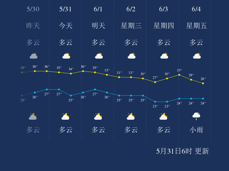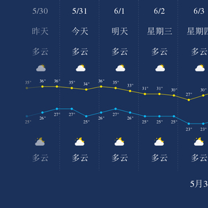 预计,今天白天多云,最高气温36℃,微风,今天夜间多云,最低气温26℃,微风。