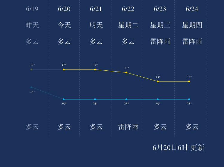 预计,今天白天多云,最高气温37℃,微风,今天夜间多云,最低气温25℃,微风。