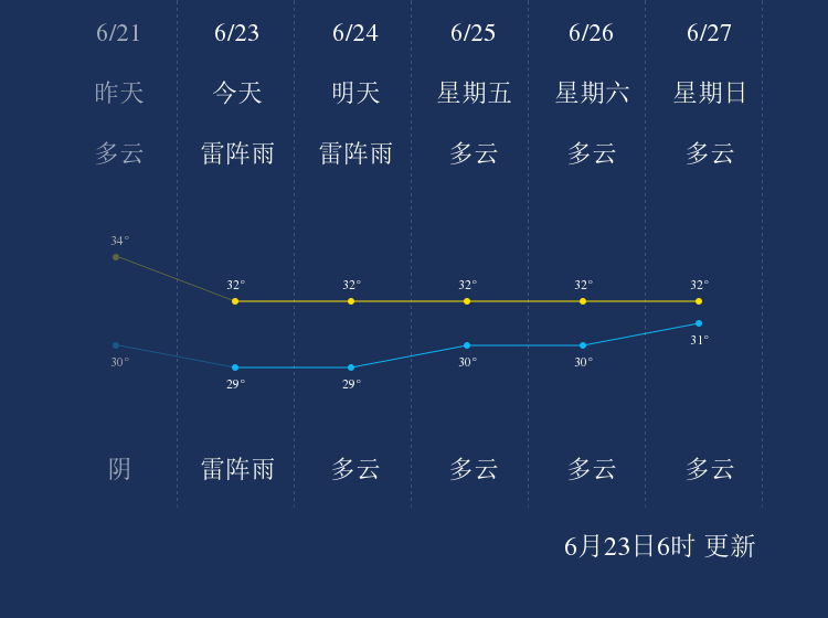 中国天气网讯 今天是6月23日星期三,一起来看天气。
