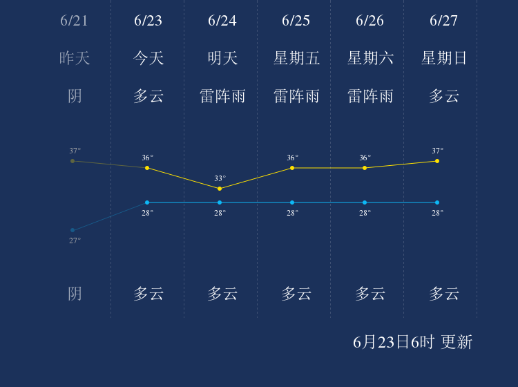 中国天气网讯 今天是6月23日星期三,一起来看天气。