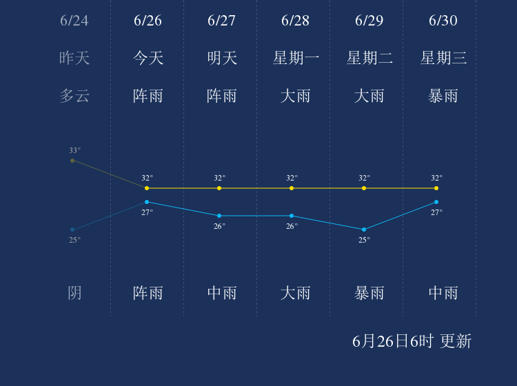 中国天气网讯 今天是6月26日星期六,一起来看天气。