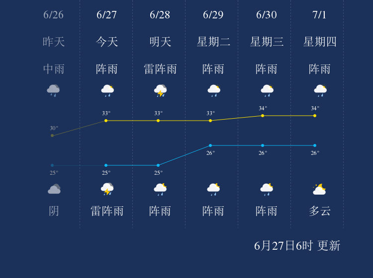 中国天气网讯 今天是6月27日星期日,一起来看天气。