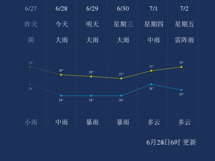中国天气网讯 今天是6月28日星期一,一起来看天气。