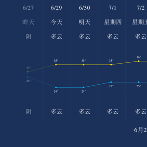 预计,今天白天多云,最高气温35℃,西南风3-4级,今天夜间多云,最低气温24℃,微风。