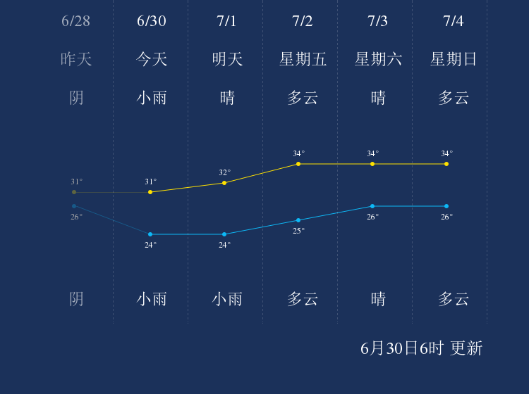 中国天气网讯 今天是6月30日星期三,一起来看天气。