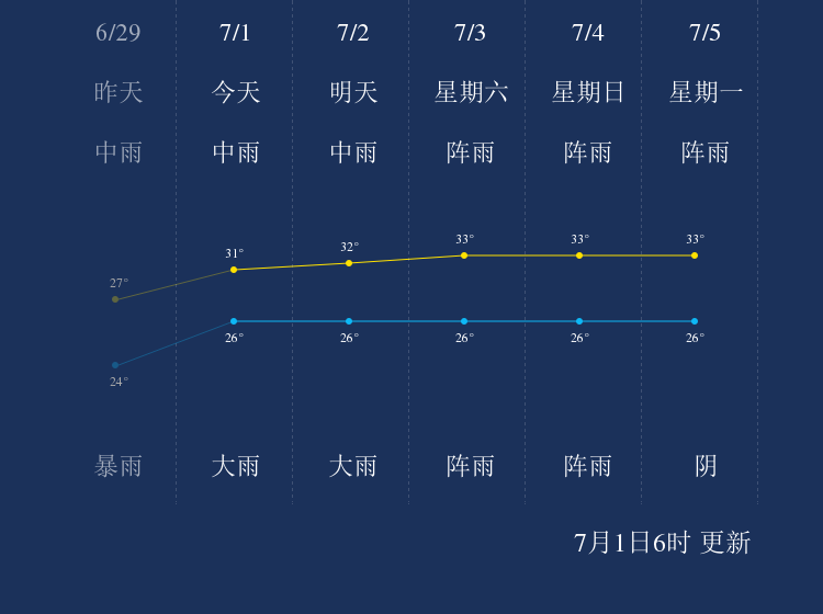 中国天气网讯 今天是7月1日星期四,一起来看天气。