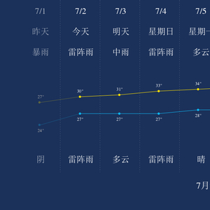 预计,今天白天雷阵雨,最高气温30℃,南风3-4级,今天夜间雷阵雨,最低气温27℃,西南风3-4级。