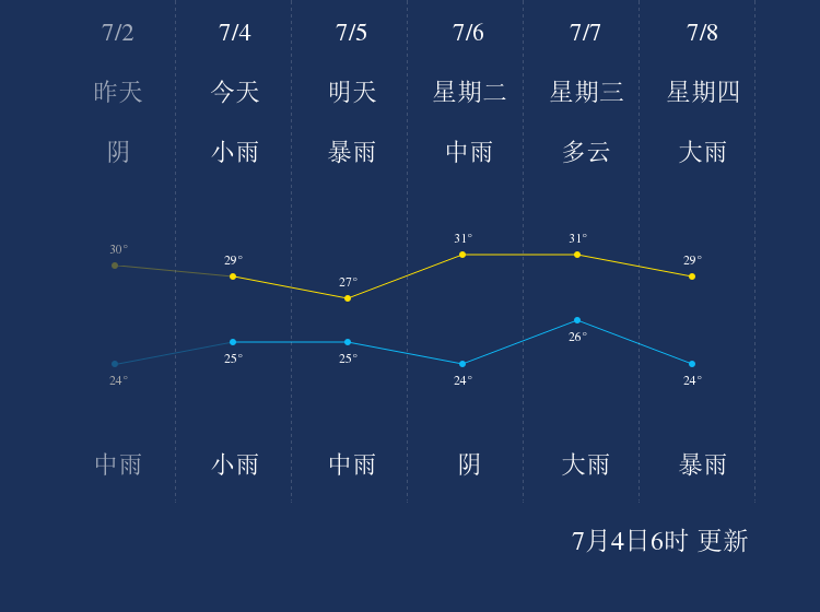 中国天气网讯 今天是7月4日星期日,一起来看天气。
