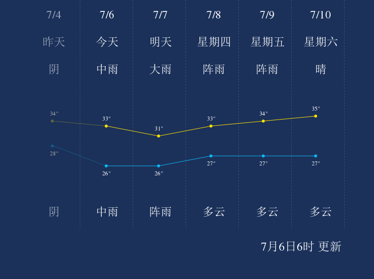 中国天气网讯 今天是7月6日星期二,一起来看天气。