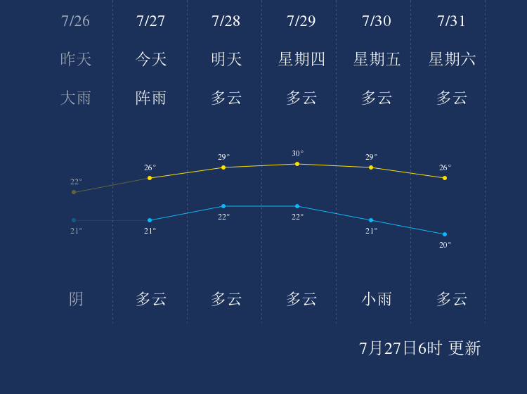 中国天气网讯 今天是7月27日星期二,一起来看天气。