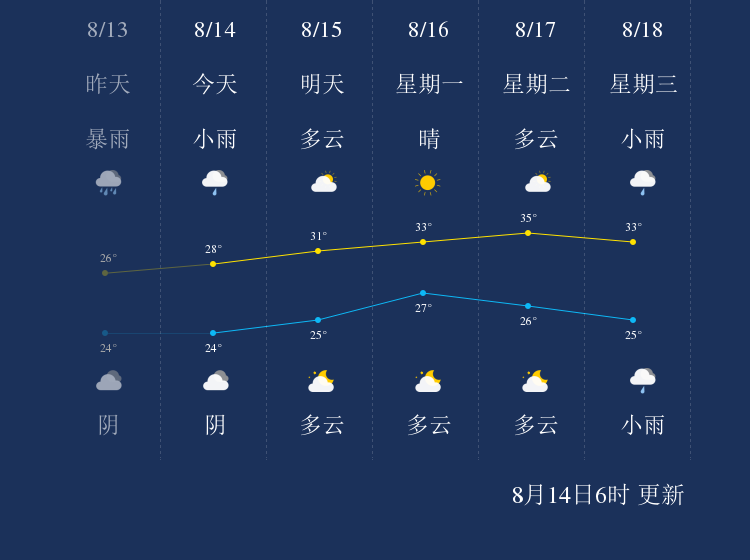 中国天气网讯 今天是8月14日星期六,一起来看天气。