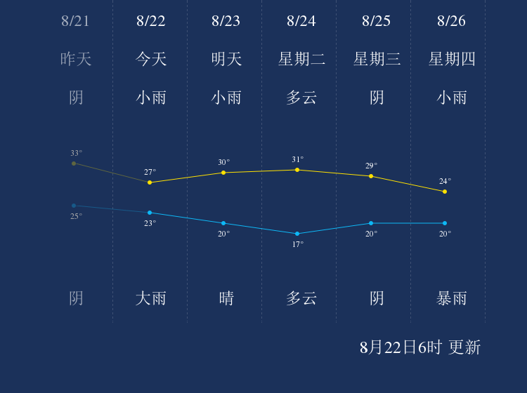 中国天气网讯 今天是8月22日星期日,一起来看天气。