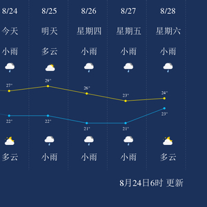预计,今天白天小雨,最高气温27℃,微风,今天夜间多云,最低气温22℃,微风。