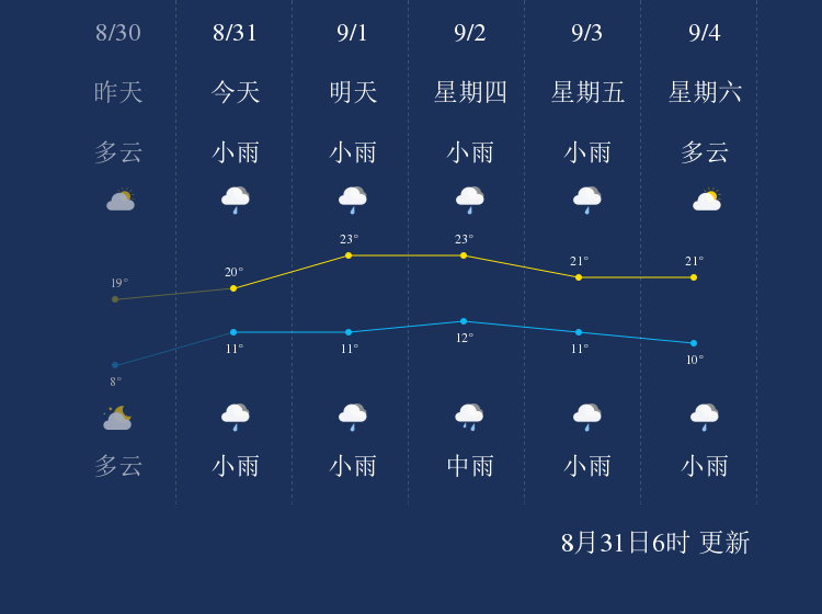 预计,今天白天小雨,最高气温20℃,微风,今天夜间小雨,最低气温11℃,微风。
