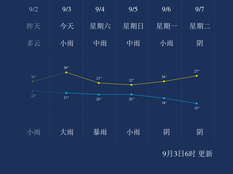 中国天气网讯 今天是9月3日星期五,一起来看天气。