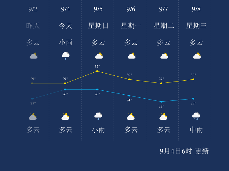 预计,今天白天小雨,最高气温29℃,微风,今天夜间多云,最低气温26℃,微风。