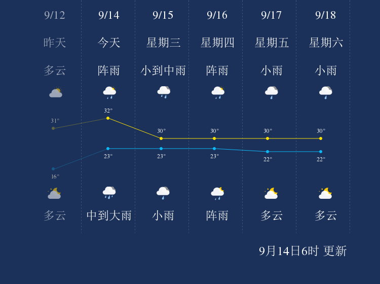 预计,今天白天阵雨,最高气温32℃,微风,今天夜间中到大雨,最低气温23℃,微风。