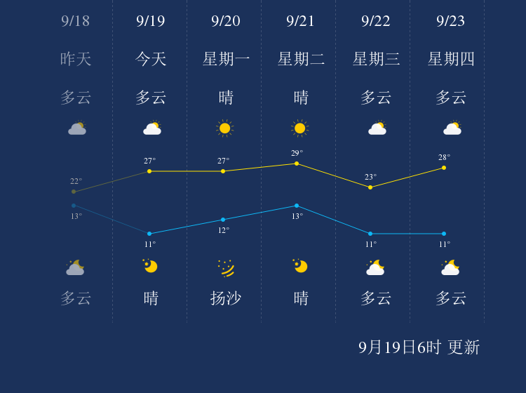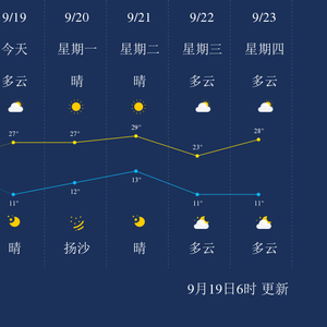 预计,今天白天多云,最高气温27℃,微风,今天夜间晴,最低气温11℃,微风。