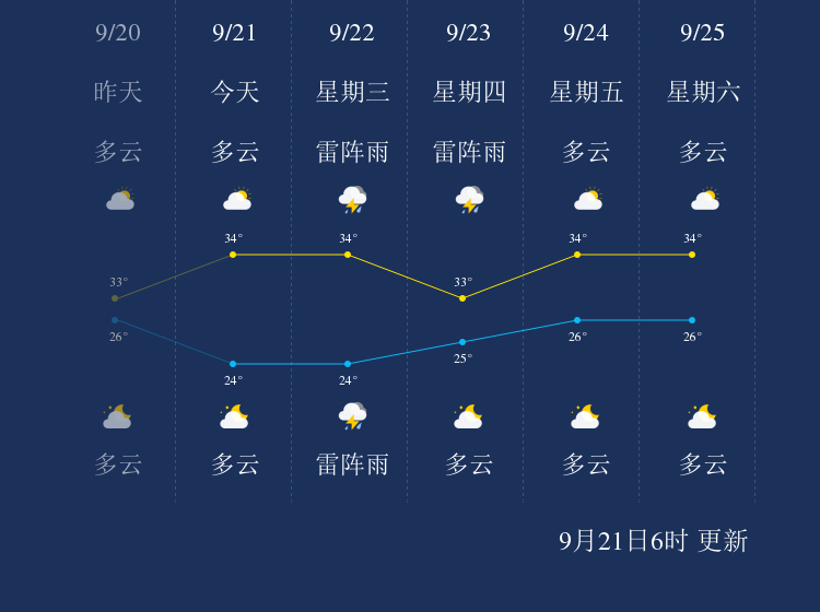 预计,今天白天多云,最高气温34℃,微风,今天夜间多云,最低气温24℃,微风。