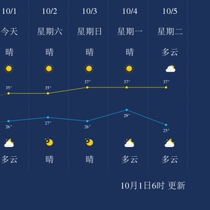- 2、明天高温:今天最高气温38℃。暑热难耐,可开空调使房间凉爽,不过最好不要低于26℃,避免室内外温差过大引发身体不适。