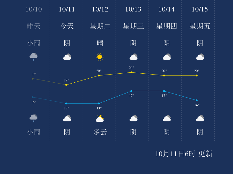 预计,今天白天阴,最高气温17℃,微风,今天夜间阴,最低气温13℃,微风。