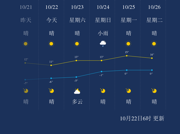 预计,今天白天晴,最高气温11℃,微风,今天夜间晴,最低气温-6℃,微风。