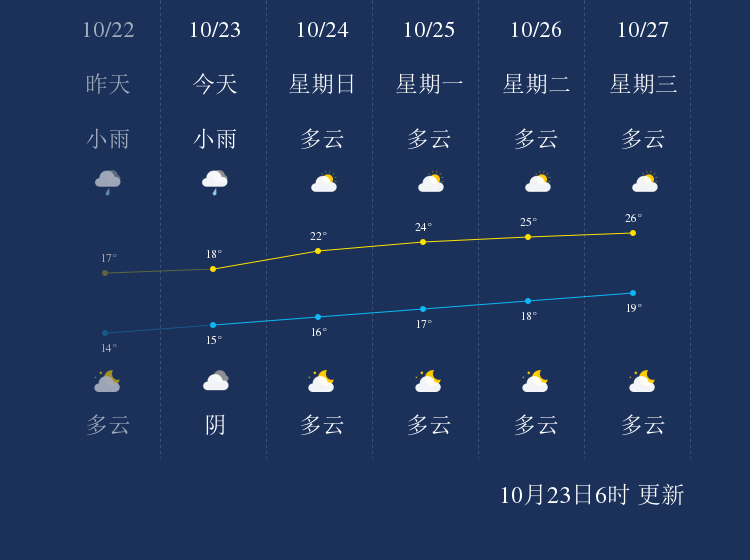 预计,今天白天小雨,最高气温18℃,微风,今天夜间阴,最低气温15℃,微风。