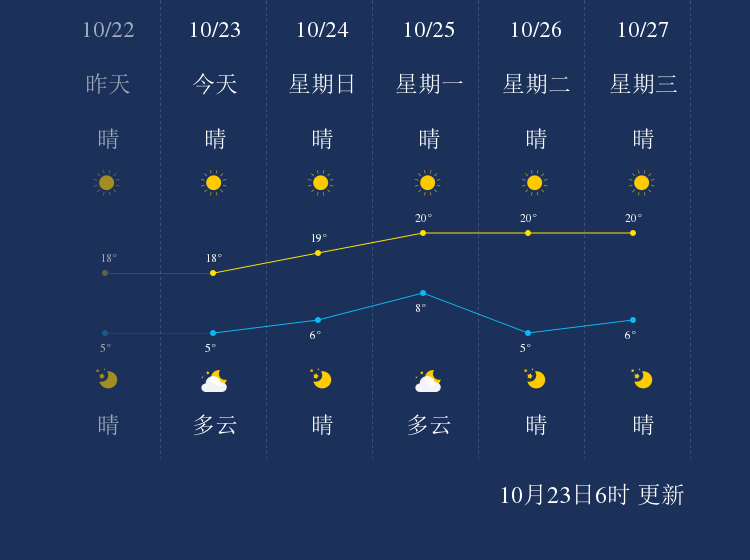 预计,今天白天晴,最高气温18℃,微风,今天夜间多云,最低气温5℃,微风。