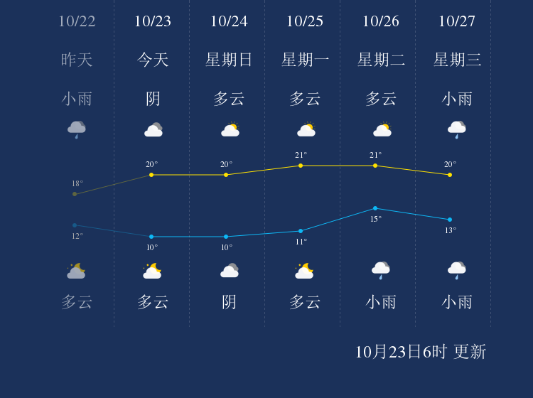 预计,今天白天阴,最高气温20℃,微风,今天夜间多云,最低气温10℃,微风。