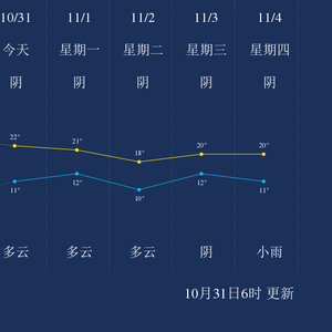 预计,今天白天阴,最高气温22℃,微风,今天夜间多云,最低气温11℃,微风。