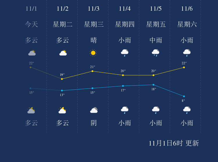 中国天气网讯 今天是11月1日星期一,一起来看天气。