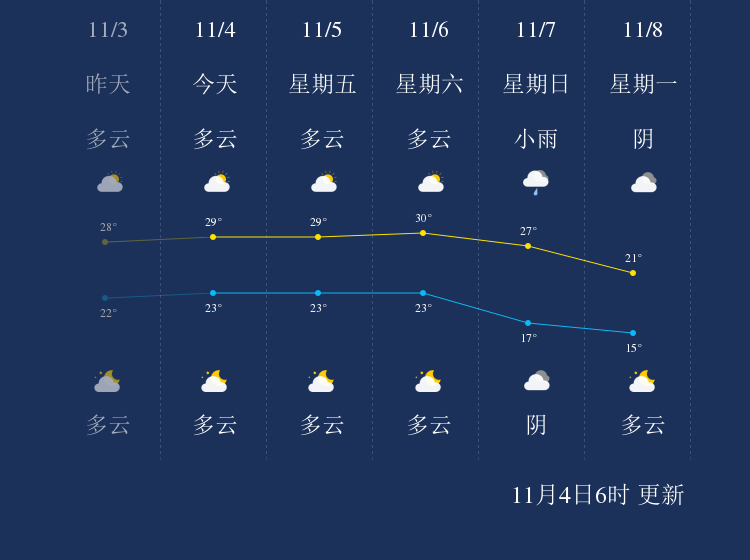 预计,今天白天多云,最高气温29℃,微风,今天夜间多云,最低气温23℃,微风。
